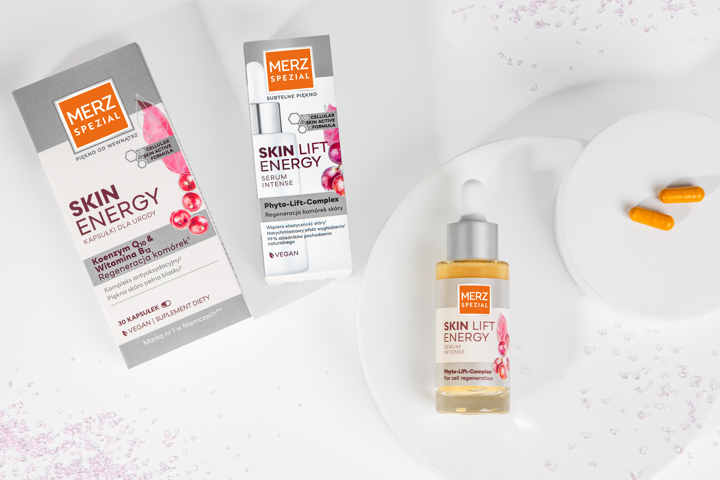 Kapsułki dla urody Merz Spezial Skin Energy dostarczają kombinację niezbędnych dla właściwego przebiegu procesów naprawczych skóry składników odżywczych, wzbogaconych o przeciwutleniacze, t.j. witaminę C, która chroni komórki przed stresem oksydacyjnym.